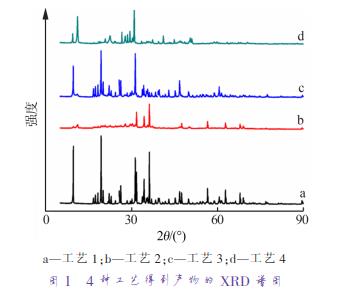 在氧化鋅-磷酸的固液反應體系中,按照n(ZnO)∶n(H3PO4)=2∶3,分別采用4種工藝:直接法不加活性劑(工藝1)、直接法加表面活性劑反應(工藝2)、先直接法反應后研磨(工藝3)、研磨不加活性劑(工藝4),比較4種工藝獲得產物的SEM、XRD測定結果,分別見圖1和圖2。將圖1中XRD譜圖進行比對發(fā)現,4種產品主要成分為不同結晶水的磷酸鋅,但在不加活性劑的情況下,直接法的產品有大量的未反應的氧化鋅(譜圖a),而先直接反應后再研磨的產品,氧化鋅的峰會降低較多(譜圖c);在有表面活性劑存在的前提下,直接法仍然含有少量氧化鋅(譜圖b),而研磨法則為純磷酸鋅產品,不含氧化鋅(譜圖d)。實驗說明,直接法工藝不管是否加表面活性劑,或是攪拌反應后再研磨,產物都會不同程度含有未反應的氧化鋅,而研磨法可以促使氧化鋅反應完全,這是本實驗采用研磨反應代替攪拌反應的主要原因之一。