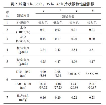先通過液相化學還原法制備原始銀粉,再利用機械球磨法制得片狀銀粉,對銀粉的形貌、粒度分布、粉體密度、比表面積、水分灰分進行表征,研究原始粉制備工藝、球磨工藝對片狀銀粉形貌尺寸、粒度分布及密度的影響。結(jié)果表明,以分散性好及平均粒徑約3μm的球形銀粉為原始銀粉、無水乙醇為介質(zhì),2mm尺寸規(guī)格的